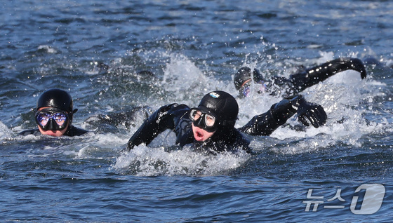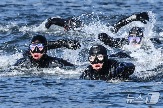 전국적으로 맹추위가 기승을 부린 22일 경남 창원 진해 군항에서 열린 혹한기 내한훈련에서 해군 심해잠수사(SSU)들이 오리발 수영을 하고 있다. (공동취재) 2026.1.22/뉴스1 © News1 윤일지 기자