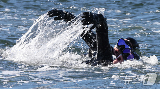 전국적으로 맹추위가 기승을 부린 22일 경남 창원 진해 군항에서 열린 혹한기 내한훈련에서 해군 심해잠수사(SSU)가 오리발 수영을 준비하고 있다. 2026.1.22/뉴스1 © News1 윤일지 기자