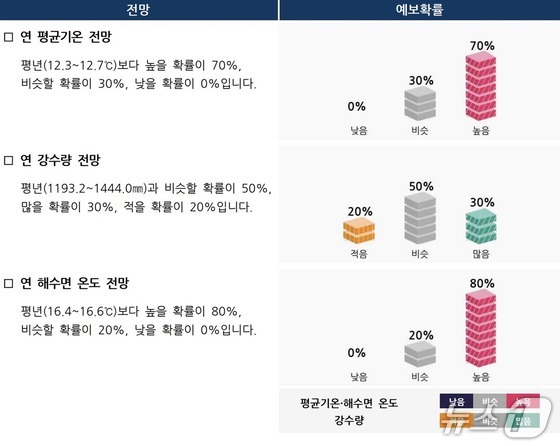 해수면 온도는 기온보다 더 뚜렷한 고온 신호를 보였다. 연평균 해수면 온도가 평년(16.4~16.6도)보다 높을 확률은 80%에 달했다. 비슷할 확률은 20%였고, 낮을 확률은 역시 0%로 분석됐다. 연중 바다 수온이 높게 유지될 가능성이 크다는 뜻이다.