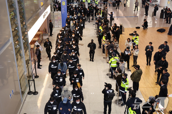 캄보디아를 거점으로 대규모 스캠 범죄를 저지른 한국 국적 피의자 73명이 23일 오전 인천국제공항 2터미널을 통해 강제 송환되고 있다. 2026.1.23/뉴스1 © News1 안은나 기자