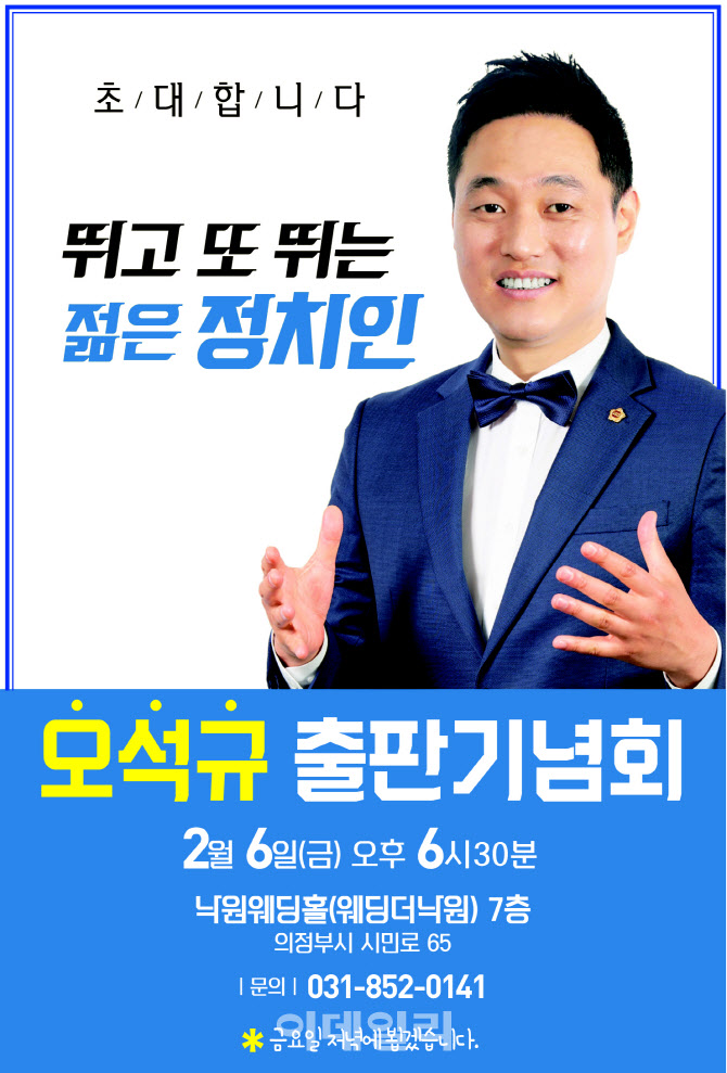 경기도의회 문화체육관광위원회 소속 오석규 의원(더불어민주당·의정부4)은 2월 6일 의정부 웨딩더낙원에서 자신이 쓴 저서 ‘뛰고 또 뛰는 젊은 정치인’ 출판기념회를 연다고 23일 밝혔다.