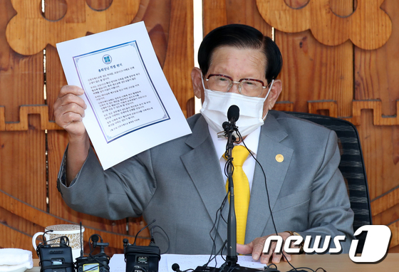 이만희 신천지예수교 증거장막성전 총회장이 지난 2020년 3월 경기 가평 신천지 평화의궁전에서 열린 코로나바이러스 감염증(코로나19) 사태 관련 기자회견에서 총회장 특별 편지를 공개하고 있다. 2020.3.2/뉴스1 © News1 허경 기자