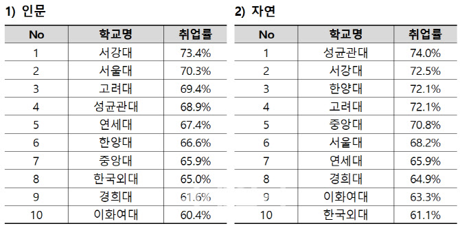 인문계열에선 서강대가 73.4%로 가장 높았으며 서울대(70.3%)·고려대(69.4%)·성균관대(68.9%)·연세대(67.4%)·한양대(66.6%)·중앙대(65.9%)가 뒤를 이었다. 교육부·국가데이터처·한국교육개발원가 작년 12월 발표한 2024년도 고등교육기관 졸업자 취업통계조사에서는 전국 일반대학 졸업자 평균 취업률이 62.8%로 집계됐다.