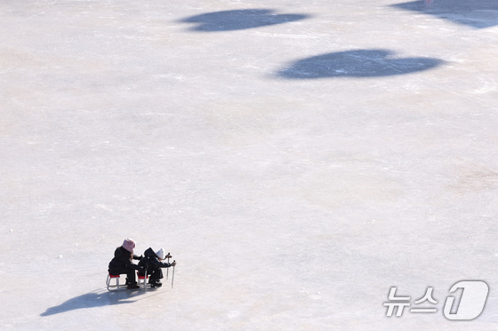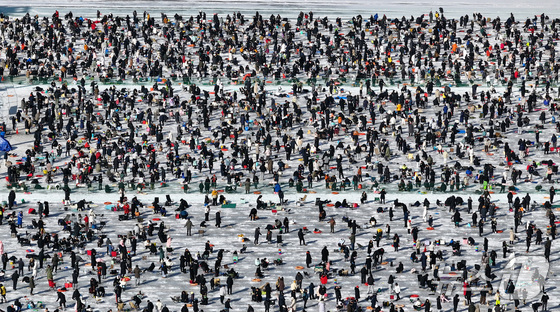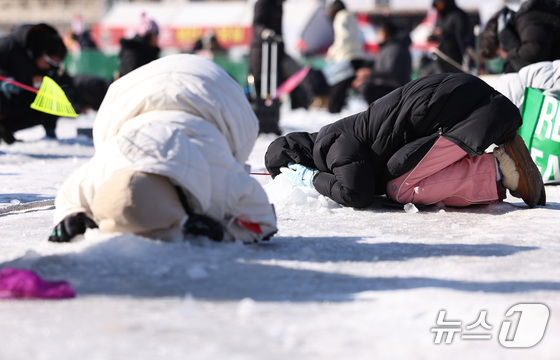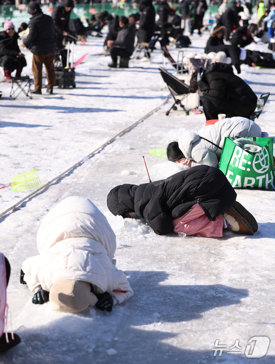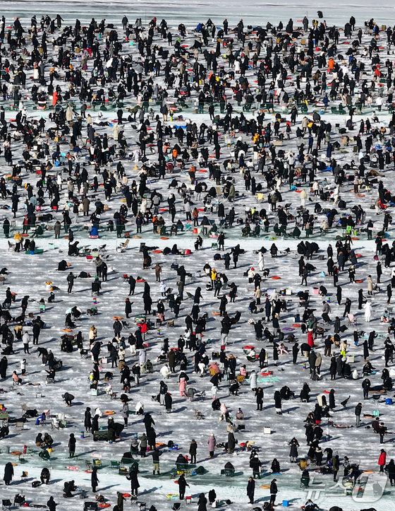 25일 강원도 화천군 화천천 일대에서 열린 '2026 화천 산천어축제'에서 관광객들이 얼음낚시를 즐기고 있다. 2026.1.25/뉴스1 © News1 구윤성 기자