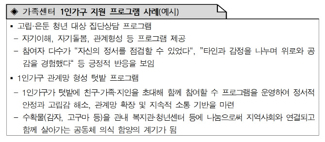 성평등가족부는 현재 전국 가족센터를 통해 1인가구의 교류·소통 등 사회적 관계망 형성과 병원 동행 등 긴급돌봄 서비스를 지원하고 있다. 앞으로 가족센터에서 활용할 수 있는 1인가구 역량강화 서비스 모델을 개발해 보급할 계획이다.