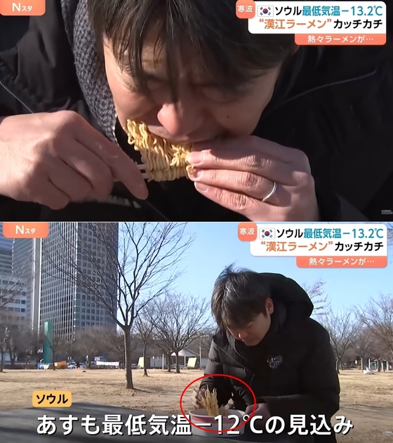 기자는 "한국이 얼마나 추운지 검증하기 위해 서울의 명물인 한강 라면으로 실험을 해보겠다"며 "라면이 얼어붙는 데 얼마나 걸리는지 확인해 보겠다"고 말했다.