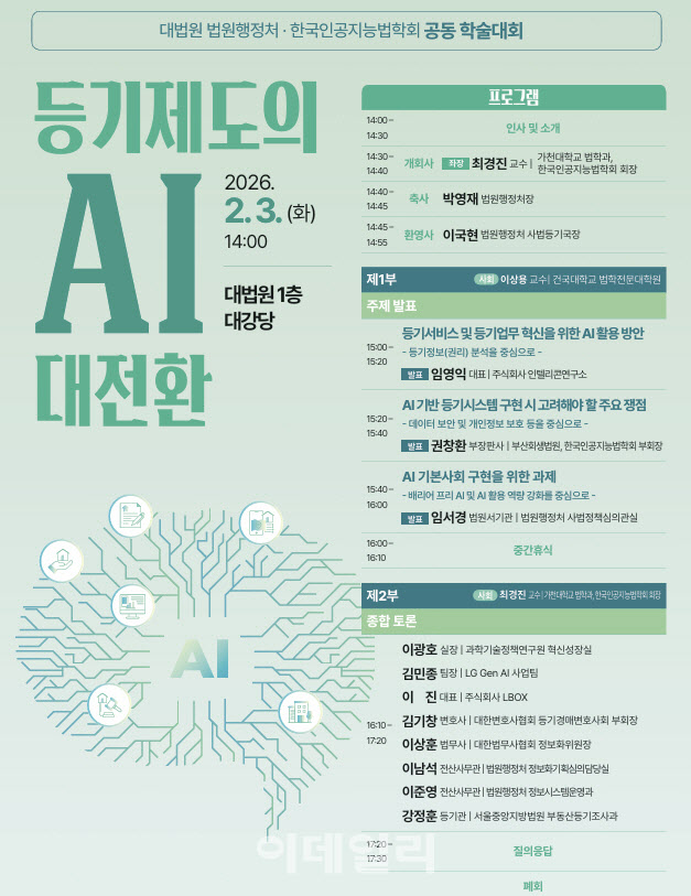 학술대회에는 법원, 학계, 등기실무 담당자, 리걸테크 업계 등 관계자들이 한자리에 모인다. 1부에서는 임영익 주식회사 인텔리콘연구소 대표가 ‘등기서비스 및 등기업무 혁신을 위한 AI활용 방안’을 주제로, 권창환(사법연수원 36기) 부산회생법원 부장판사가 ‘AI 기반등기시스템 구현 시 고려해야 할 주요 쟁점’을 주제로 발표한다.