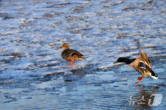연일 동장군이 기승을 부리고 있는 가운데 28일 경북 포항시 남구 연일읍 유강리 형산강에서 겨울 철새들이 얼음판 위에 앉아 있다. 2026.1.28/뉴스1 © News1 최창호 기자