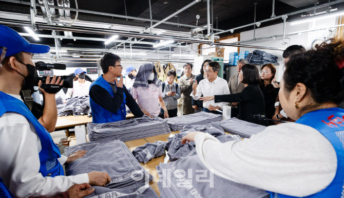지난해 11월 7일 오전 김동연 도지사가 성남만남지역자활센터에서 빨래 정리 업무를 도우며 직원들과 이야기를 나누고 있다.(사진=경기도)