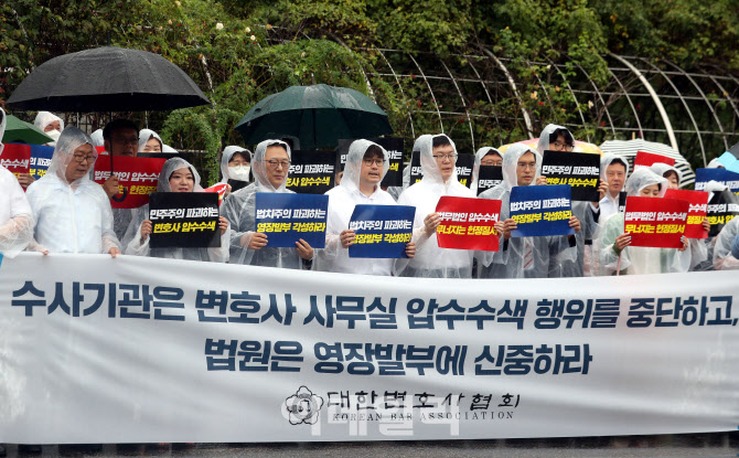 지난 2023년 8월 28일 오전 서울 서초구 법원삼거리에서 열린 ‘변호사 사무실 압수수색 행위 중단, 변호인의 의뢰인 비밀유지권 보장 촉구’ 기자회견이 열리고 있다. (사진=뉴시스)
