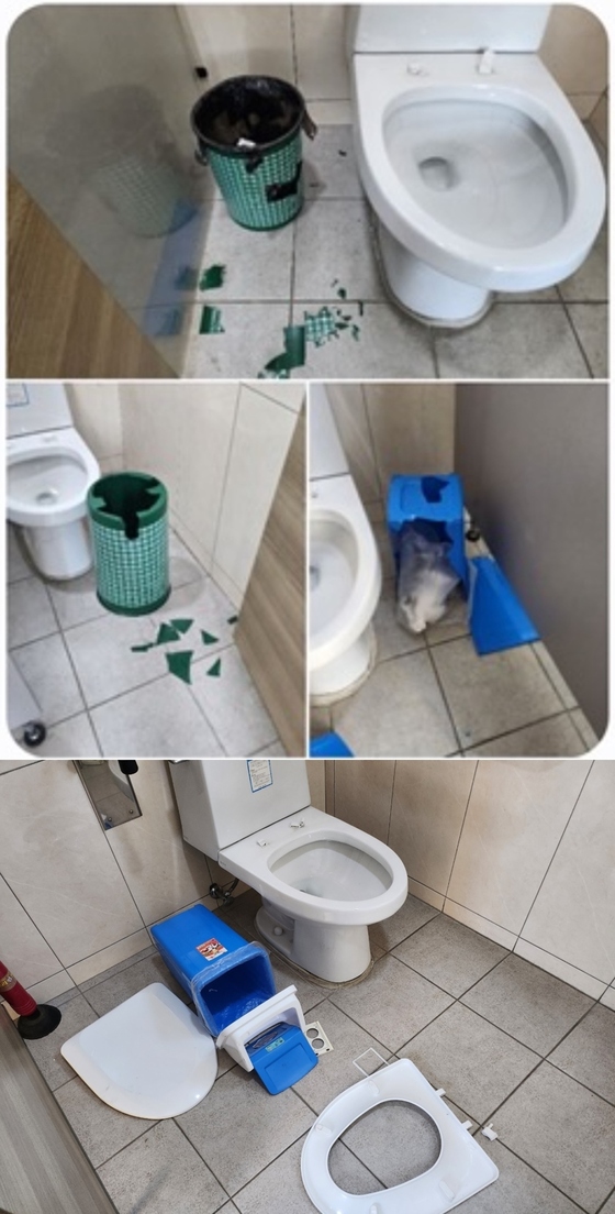 글을 올린 A 씨는 "새벽 시간대 누군가가 건물 내부 물건을 부수는 일이 반복되고 있다"며 "변기통 뚜껑, 쓰레기통 등 플라스틱 재질 물건들이 주로 파손됐다"고 밝혔다.