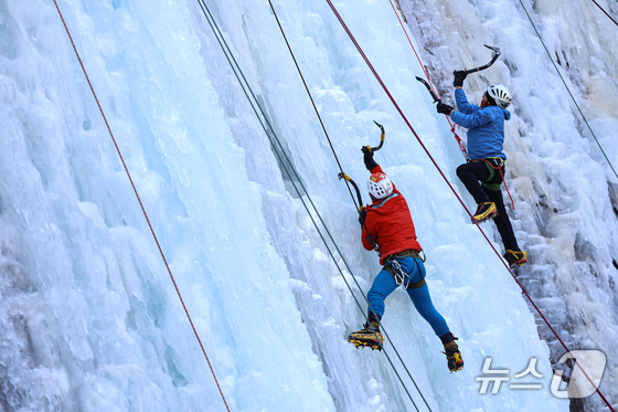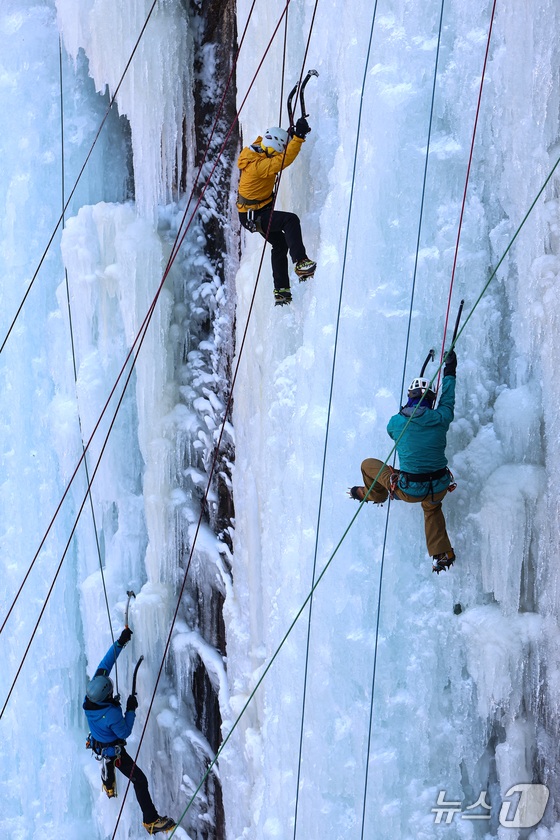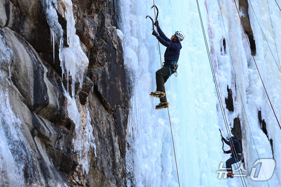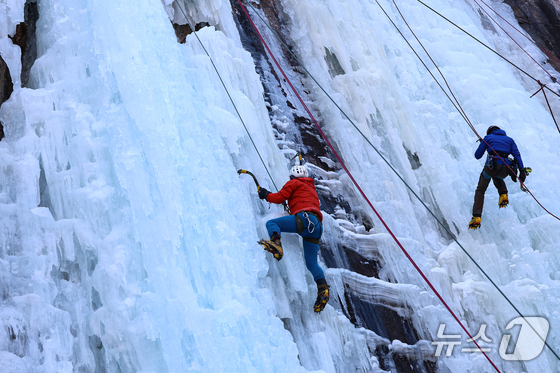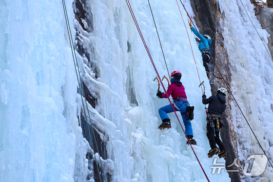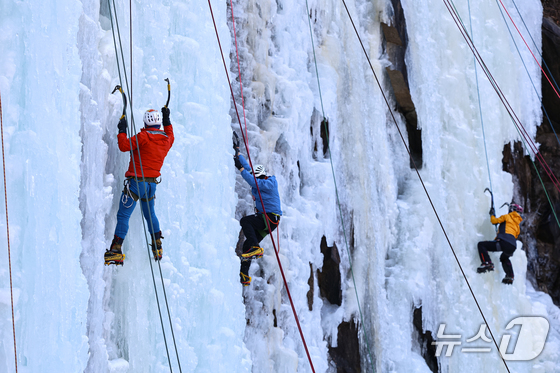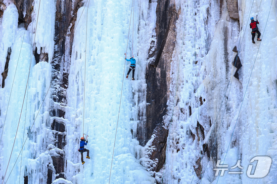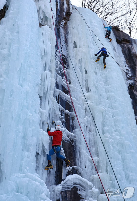 1일 경기 양주시 가래비 빙벽을 찾은 등반 동호인들이 빙벽을 오르고 있다. 2026.2.1/뉴스1 © News1 김도우 기자
