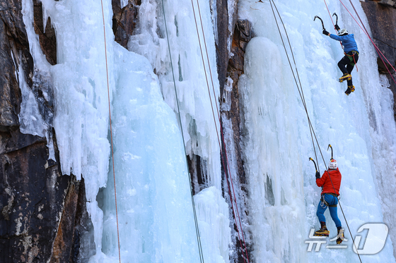 매서운 한파가 이어진 1일 경기도 양주시 가래비빙벽장은 주말을 맞이해 이른 시간부터 많은 클라이밍 동호인이 모여들었다. 며칠 동안 이어진 한파로 얼음이 적당히 단단해져 빙벽타기에는 최적기다.