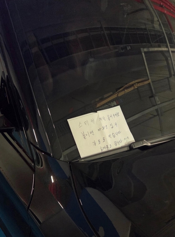 차량에 부착된 메모에는 '스티커 제발 붙여주세요. 붙이면 아파트 입구 가로로 막습니다. 휴대전화는 끕니다 ^^' 라는 문구가 적혀 있었다.