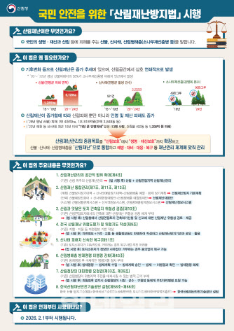 또 산림 인접 지역에서 건축 허가나 신고 시 산림재난 위험성을 검토하도록 하고, 산림재난 대응을 위한 한국산림재난안전기술공단 설립 등에 관한 사항도 포함하고 있다. 김인호 산림청장은 “산림재난방지법 시행령, 시행규칙 제정을 통해 산불·산사태·산림병해충을 통합 관리할 수 있는 제도적 기반이 더욱 강화됐다”며 “산림재난으로부터 국민의 생명과 재산을 보호하기 위해 법과 제도가 현장에서 실질적인 역할을 할 수 있도록 적극적으로 추진해 나가겠다”고 말했다.