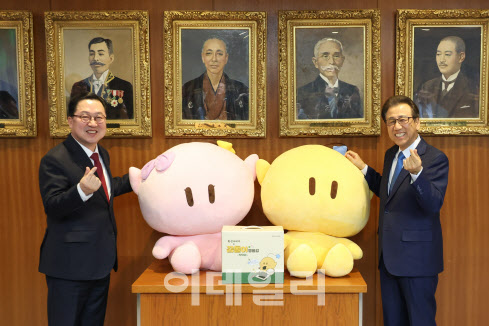 이장우 대전시장(왼쪽)이 3일 일본 삿포로시청에서 아키모토 가쓰히로 삿포로시장과 기념촬영을 하고 있다. (사진=대전시 제공)