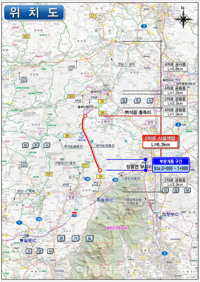 한편 ‘국지도 39호선 장흥~광적 도로공사’는 양주시 장흥면 부곡리부터 광적면 가납리까지 총 연장 6.3㎞를 왕복 2차로(폭 10.5m)로 개량하는 사업이다. 총사업비 1150억원을 투입하며 지난 2020년 5월 착공해 오는 2027년 12월 완공을 목표로 진행하고 있다.