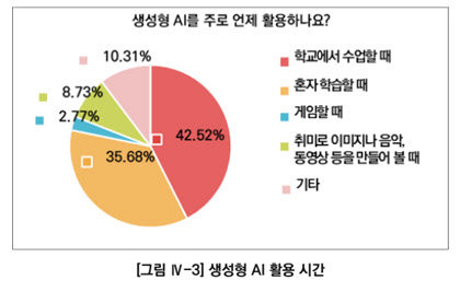 학생들은 주로 학습할 때 AI를 쓰는 것으로 나타났다. AI 활용 경험이 있는 2만 5104명 중 42.52%(1만 674명)는 학교에서 수업할 때 AI를 썼다고 했다. 35.68%는 혼자 학습할 때 AI를 활용했다고 답했다. 학습에 활용한 비율만 78.2%를 차지한다.