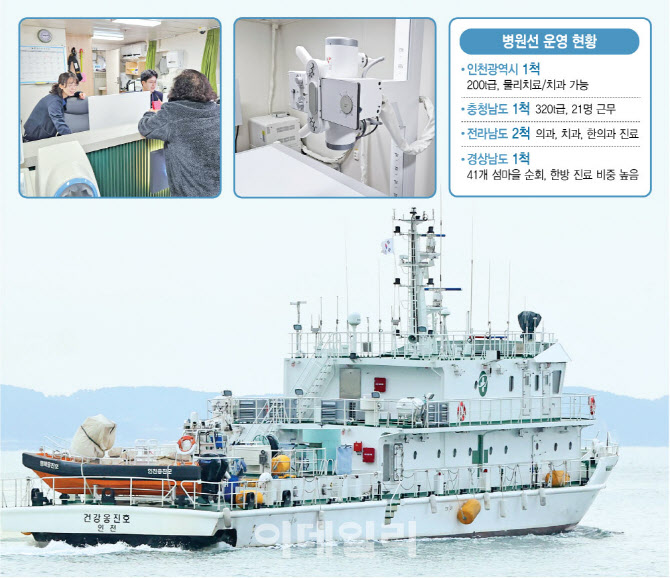 인천시 옹진군은 이같은 의료 공백 해소를 위해 병원선을 운영하고 있다. 지난달 26일 기자가 동승한 270t급 병원선 ‘건강옹진호’는 옹진군 관내 17개 섬을 순회하며 의료서비스를 제공한다. 내과·치과·한의과 공중보건의가 기본 진료와 처방 뿐만 아니라 △물리치료 △침 치료 △X레이·골밀도 검사 △스케일링·치주질환 치료 등을 실시한다.