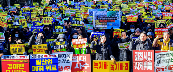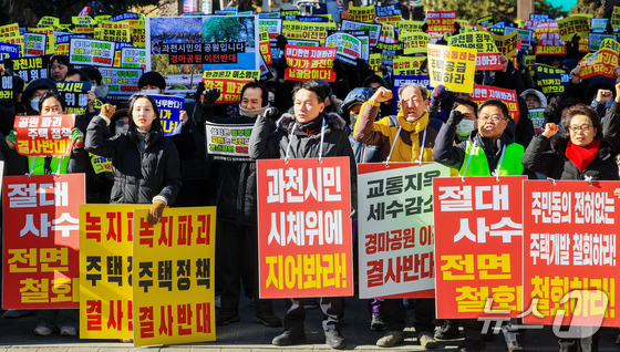 과천경마공원 이전 반대 비상대책위원회와 과천 시민들이 7일 경기 과천시 중앙공원 분수대 앞에서 열린 '과천경마공원 이전 반대 집회'에서 구호를 외치고 있다. 2026.2.7 © 뉴스1 이호윤 기자