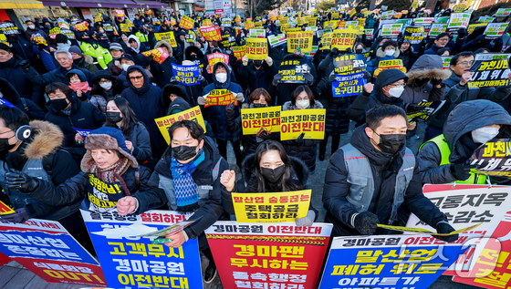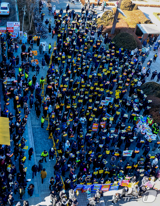 한국마사회노동조합 조합원들이 5일 경기 과천시 한국마사회 본관에서 열린 경마공원 이전 추진 반대 투쟁 결의대회에서 구호를 외치고 있다. 2026.2.5 © 뉴스1 김도우 기자