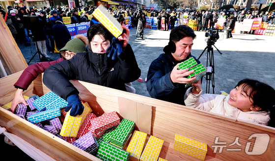 과천경마공원 이전 반대 비상대책위원회와 과천 시민들이 7일 경기 과천시 중앙공원 분수대 앞에서 열린 '과천경마공원 이전 반대 집회'에서 벽돌을 던지며 퍼포먼스를 하고 있다. 2026.2.7 © 뉴스1 이호윤 기자