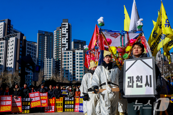 이날 집회는 과천 경마공원 이전 및 해당 부지에 정부가 주택 1만호를 개발한다는 계획에 반대 목소리를 내고자 열렸다. 반대 구호를 외친 집회 참석자들은 '과천시' 글자가 적힌 영정과 상여를 옮기는 퍼포먼스도 펼쳤다.