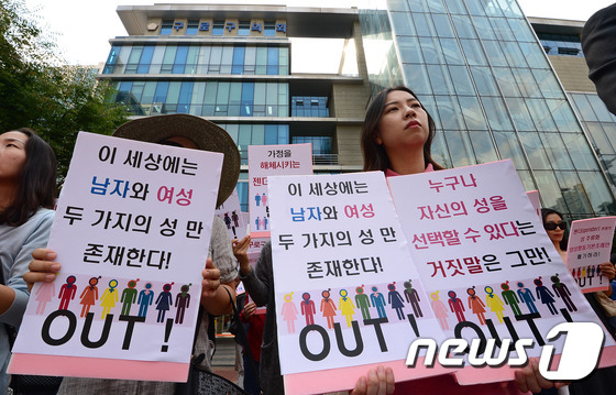 건강과가정을위한학부모연합, 양성평등연대 등 시민단체 회원들이 서울 구로구의회 앞에서 '성주류화, 여성특혜 포함된 구로구 양성평등기본조례안 반대' 기자회견을 하고 있다. 2015.9.14 / © 뉴스1 박세연 기자