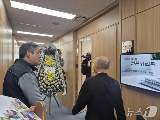 인권위 노조는 이날 전원위 직전 '윤석열 방어권 인용 의결-인권위 독립성 훼손 1주기'라 적힌 근조 화환을 전원위 회의실 앞에 설치하며 반발했다.