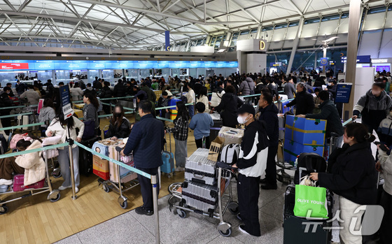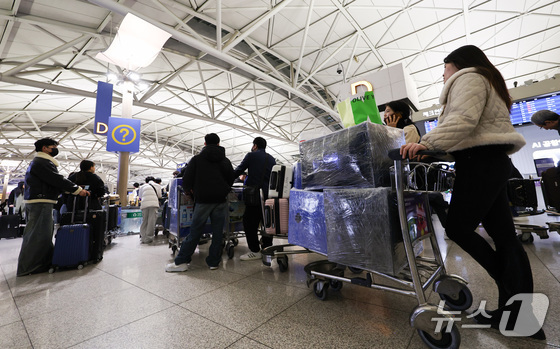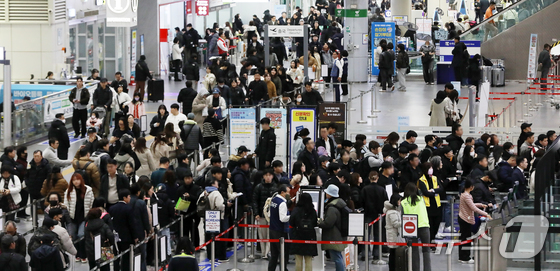설 명절 연휴를 앞둔 12일 오전 인천국제공항 1터미널 출국장이 이용객들로 붐비고 있다. 2026.2.12 © 뉴스1 최지환 기자