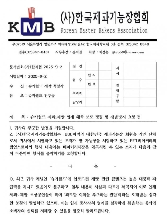 그러면서 "공문이 발송되던 당시 협회 회장은 국내에 17명뿐인 제과제빵 명장으로 알려진 이석원 명장이었다. 이 명장은 최근 제과제빵 서바이벌 프로그램 '천하제빵'에 심사위원으로 참여해 제작발표회에서 대한민국 제과제빵업계의 발전이 많이 이뤄졌으면 한다고 밝힌 장본인이다"라고 문제 삼았다.