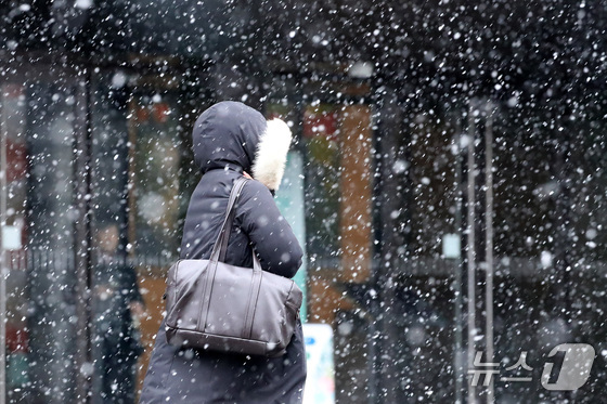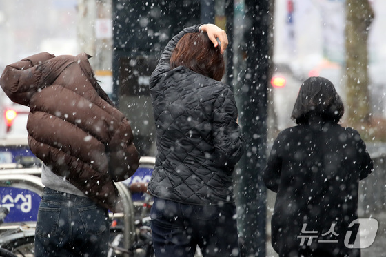 24일 오후 대구 수성구 대구은행네거리 인근에 갑작스레 많은 눈이 내리자, 우산을 준비하지 못한 시민들이 발걸음을 재촉하고 있다. 2026.2.24 © 뉴스1 공정식 기자