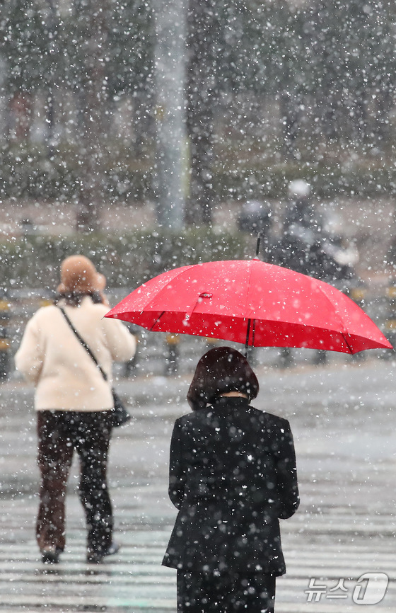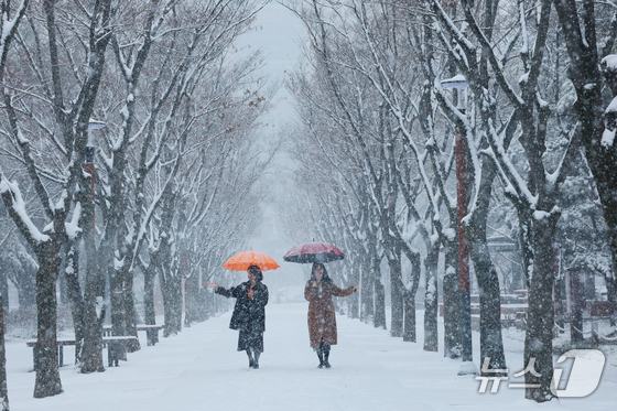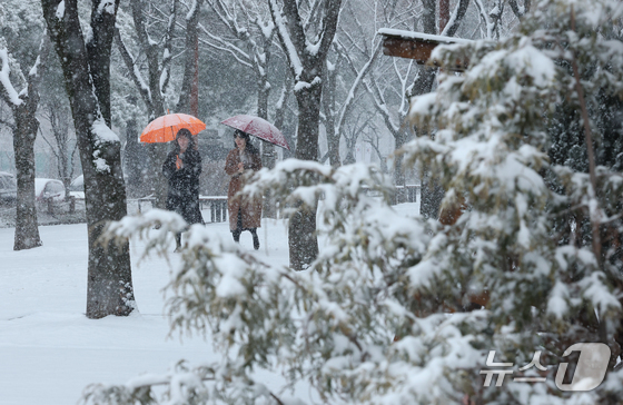 대전과 충청지역 곳곳에 대설주의보가 발효된 24일 오전 대전 서구 보라매공원에서 시민들이 우산을 쓰고 지나고 있다. 2026.2.24 © 뉴스1 김기태 기자
