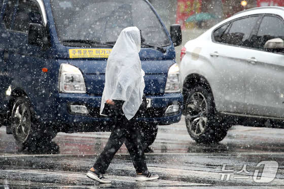 24일 오후 대구 수성구 대구은행네거리 인근에 갑작스레 많은 눈이 내리자, 우산을 준비하지 못한 시민이 비닐로 몸을 가린 채 발걸음을 재촉하고 있다. 2026.2.24 © 뉴스1 공정식 기자