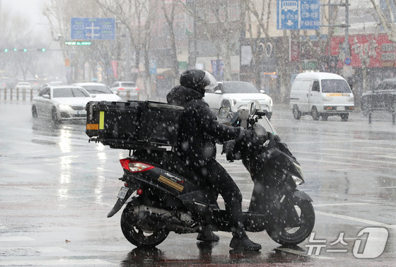 24일 오후 대구 수성구 대구은행네거리 인근에 갑작스레 많은 눈이 내리는 가운데 배달 라이더가 신호 대기 중 눈을 맞고 있다. 2026.2.24 © 뉴스1 공정식 기자