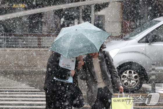 24일 오후 대구 수성구 대구은행네거리 인근에 갑작스레 많은 눈이 내리자, 우산을 쓴 시민들이 발걸음을 재촉하고 있다. 2026.2.24 © 뉴스1 공정식 기자