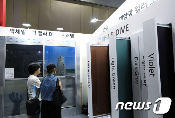 경기 고양 킨텍스에서 열린 세계 태양에너지 엑스포를 찾은 관람객들이 벽체 일체형 컬러 BIPV 시스템을 살펴보고 있다. © 뉴스1 박정호 기자