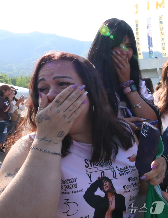 방탄소년단(BTS)의 지민과 정국을 본 브라질 아미(방탄소년단 팬덤명)들이 감격에 겨워 눈물을 흘리며 기쁨을 표현하고 있다. 2025.6.11 © 뉴스1 권현진 기자