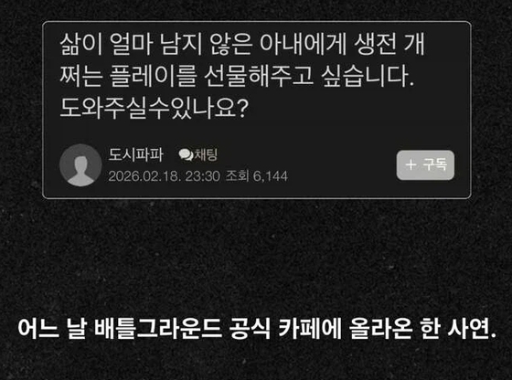 지난 18일 서바이벌 게임 배틀그라운드(배그) 공식 카페에 한 남편의 글이 올라왔다. "삶이 얼마 남지 않은 아내에게 생전 개쩌는 플레이를 선물해 주고 싶다. 도와달라"는 내용이었다.