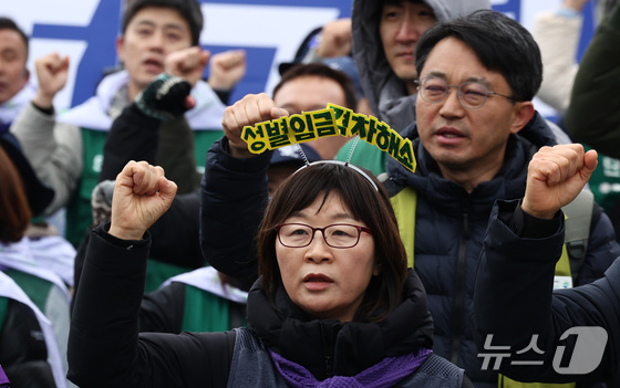 양경수 민주노총 위원장은 "같은 일을 하면서도 성별에 따라 임금이 다르고, 여성들이 많이 일하는 돌봄·보건의료 노동이 저평가되는 구조가 성별 임금 격차의 핵심"이라며 "성평등 임금 공시제를 쟁취하고 차별금지법을 제정해 불평등을 끝내자"고 말했다.