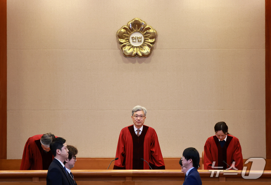 김상환 헌법재판소장과 재판관들이 지난달 26일 서울 종로구 헌법재판소에서 열린 2월 심판사건 선고를 위해 대심판정에 참석하고 있다. 2026.2.26 © 뉴스1 이호윤 기자