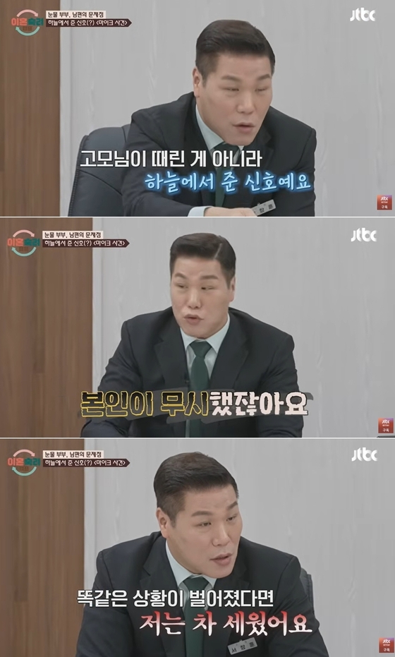 이를 지켜보던 서장훈은 아내에게 "왜 결혼했냐"며 "이런 상황은 사실 하늘이 보내준 신호일 수도 있다. 만약 내가 같은 상황을 겪었다면 바로 차를 세웠을 것이다"라고 남편의 태도를 지적했다.