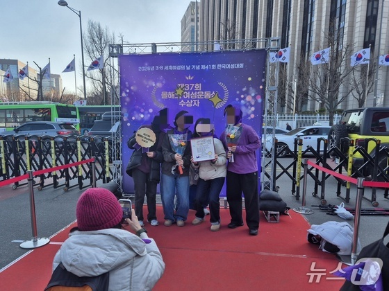 7일 한국여성단체연합이 서울 종로구 서십자각에서 개최한 제41회 한국여성대회에서 참석자들이 기념사진을 찍는 모습. 2026.3.7 © 뉴스1 신윤하 기자