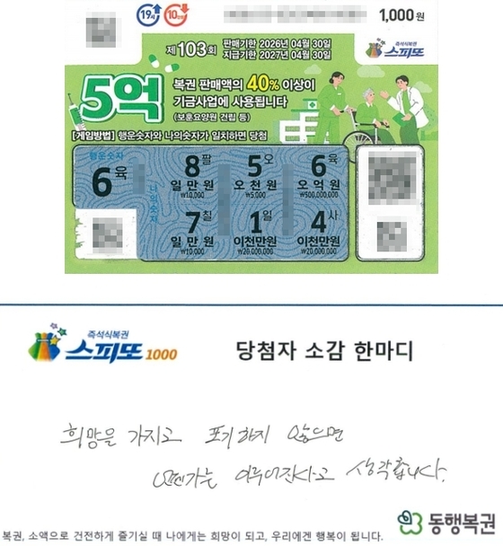 최근 복권 수탁사업자 동행복권은 공식 홈페이지를 통해 '스피또1000' 103회차 1등 5억원 당첨된 A 씨의 사연을 소개했다. A 씨가 복권을 구매한 곳은 대구 수성구 동원로에 위치한 복권 판매점이다.