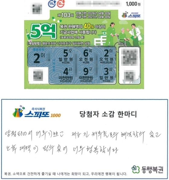 최근 복권 수탁사업자 동행복권은 공식 홈페이지를 통해 '스피또1000' 103회차 1등에 당첨돼 5억원을 받게 된 A 씨의 사연을 소개했다. A 씨가 복권을 구매한 곳은 경기 안성시 공도읍에 위치한 복권 판매점이다.