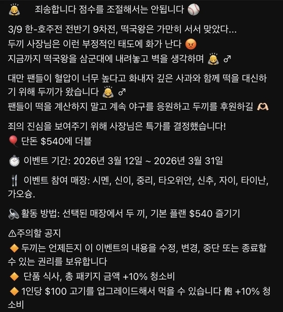홍보 글에는 "한국과 호주 경기에서 가만히 서서 삼진을 당했다. 화가 난 대만 팬들에게 깊은 사과와 함께 떡을 전하기 위해 두끼가 왔다"는 식의 설명도 담겨있다. 이벤트 기간은 3월 12일부터 3월 31일까지로 안내됐으며 시먼, 신이, 중리, 타오위안, 신주, 자이, 타이난, 가오슝 등 대만 여러 매장에서 진행된다고 적혀 있다.