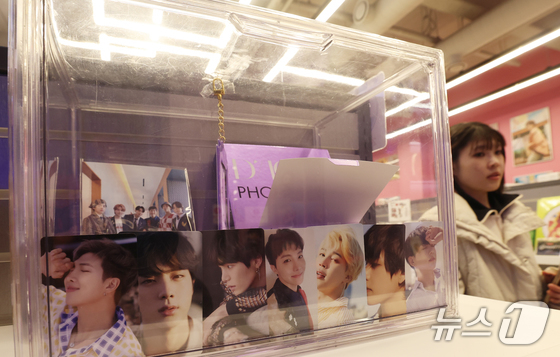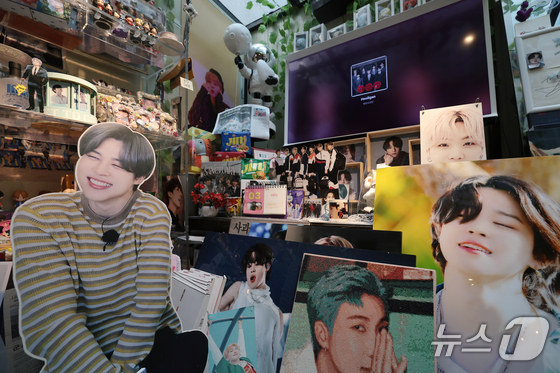 그룹 방탄소년단(BTS)의 광화문 공연을 앞둔 20일 서울 용산구 하이브 인근 카페에 멤버들의 굿즈가 전시돼 있다. 2026.3.20 © 뉴스1 권현진 기자
