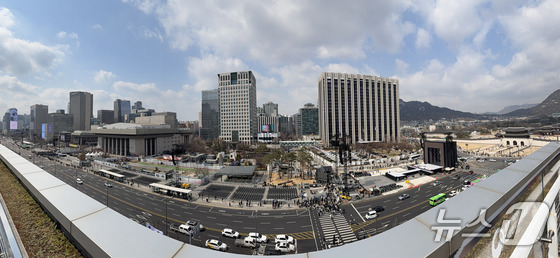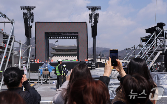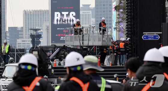 방탄소년단(BTS) 완전체 컴백 공연을 하루 앞둔 20일 서울 광화문광장 공연장이 공연 막바지 준비로 분주한 모습을 보이고 있다. 2026.3.20 © 뉴스1 박지혜 기자