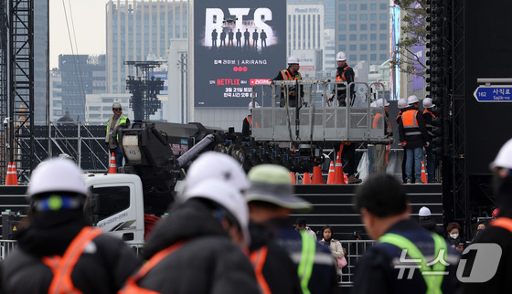 그룹 방탄소년단(BTS)의 ‘BTS 컴백 라이브: ARIRANG’(BTS THE COMEBACK LIVE | ARIRANG) 공연을 하루 앞둔 20일 서울 종로구 광화문광장은 세계 각국에서 모이는 아미(ARMY)들을 맞이하기 위해 설치 인력과 관계자들이 분주하게 오가며 거대한 공연 준비 작업을 이어가고 있다.