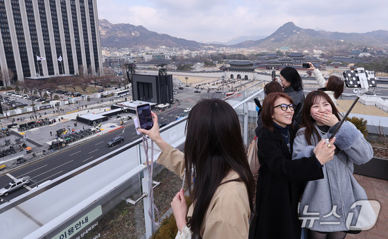 방탄소년단(BTS) 완전체 컴백 공연을 하루 앞둔 20일 서울 광화문광장 인근에서 아미(ARMY·팬덤명)들이 공연장을 배경으로 기념 사진을 찍고 있다. 2026.3.20 © 뉴스1 박지혜 기자